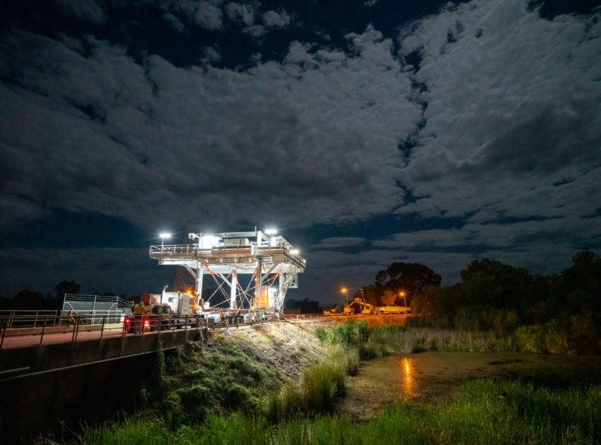The crane, which straddles the Victoria Highway as it passes over the Diversion Dam Wall, was assembled in our laydown yard in Kununurra, then transported complete during the scheduled road closure.