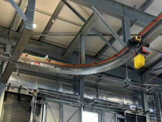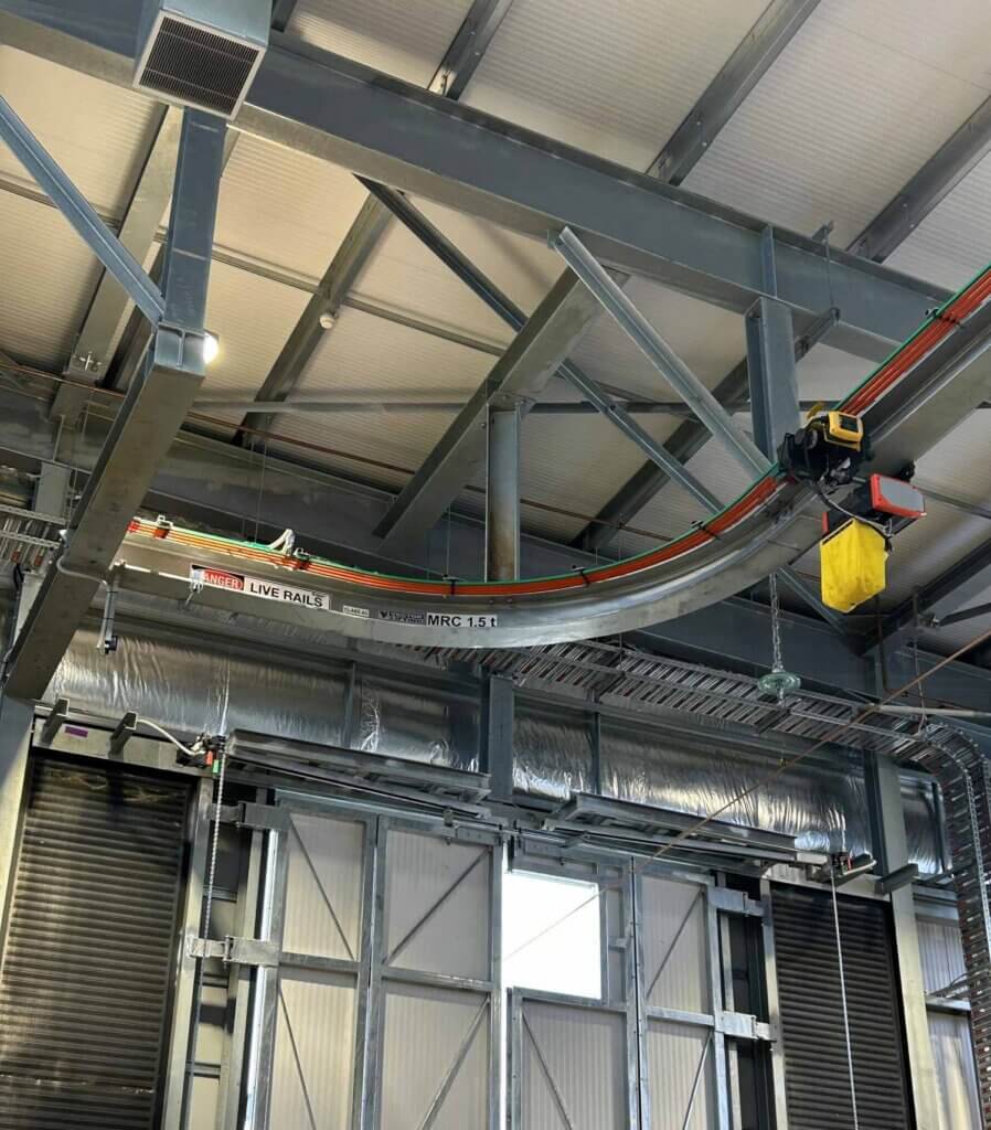 The system can be configured with straight tracks, curves, switches, and turntables, allowing flexible routing to suit specific process layouts. Depending on load capacity and operational needs, monorails can be equipped with manual, electric, or motorized trolleys, and paired with electric wire rope hoists or chain hoists.