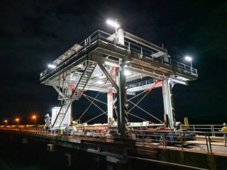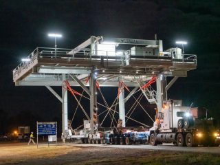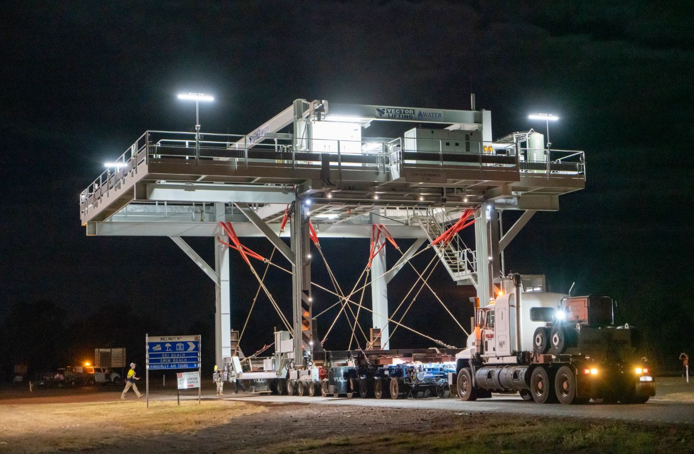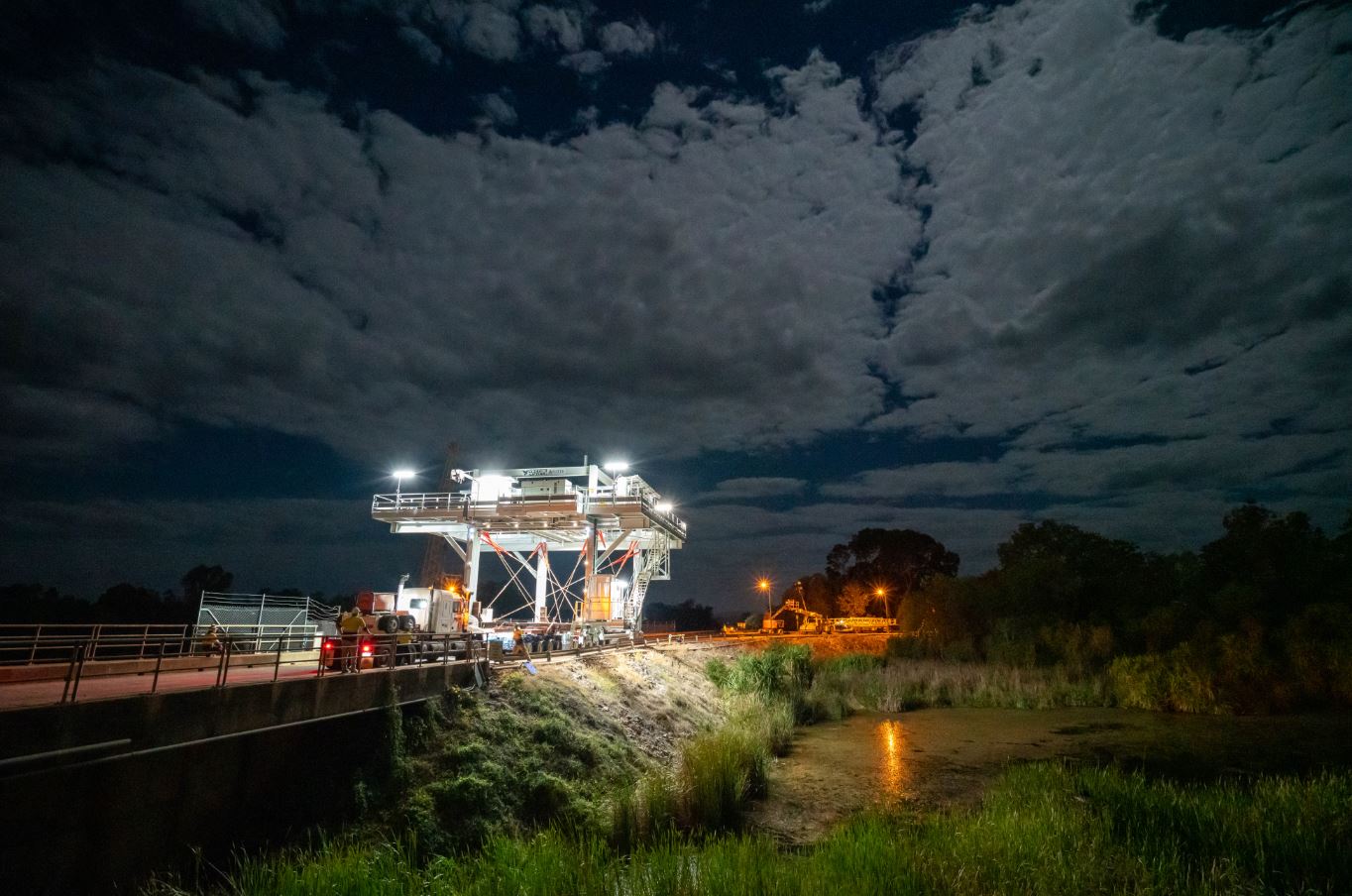 The crane, which straddles the Victoria Highway as it passes over the Diversion Dam Wall, was assembled in our laydown yard in Kununurra, then transported complete during the scheduled road closure.